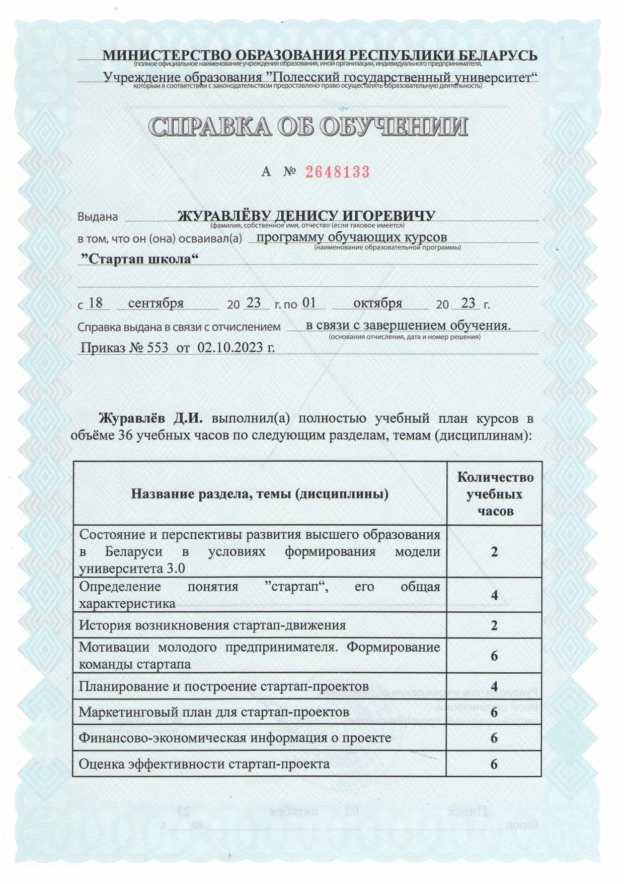 Студенты Бурмистров М.Е. (группа 18лл3) и Журавлев Д.И. (группа 19ЛЛ9), осуществляющие научную деятельность на кафедре «Поликлиническая терапия и мобилизационная подготовка в здравоохранении» под руководством заведующей кафедрой к.м.н. Бурмистровой Л.Ф. и старшего преподавателя кафедры Петрова М.В. прошли обучение по программе «Стартап школа» в Полесском государственном университете с 18 сентября 2023 г. по 01 октября 2023 г.